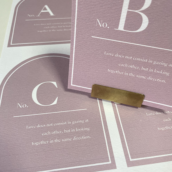 【Rukbat】では、おしゃれなハンドメイドのウェディングアイテムをお届けしております。テーブルナンバーやお車代用の封筒、メニュー表やゲストブック・席札まで幅広く取り揃えております。ご希望があればオーダーなども承っておりますので、お気軽にご相談ください。